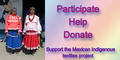 The Mexican Indian Textiles project allows a broad audience of students, cultural anthropologist, graphic and textile artists, and others to experience these endangered cultures of Mexico. Your donation will help to continue the documentation and web site presentation of these wonderful textiles and cultures to the broadest possible audience. There is much work that remains to be done and with your help we can make this project a lasting historical and informative place for people to learn and enjoy about these peoples.